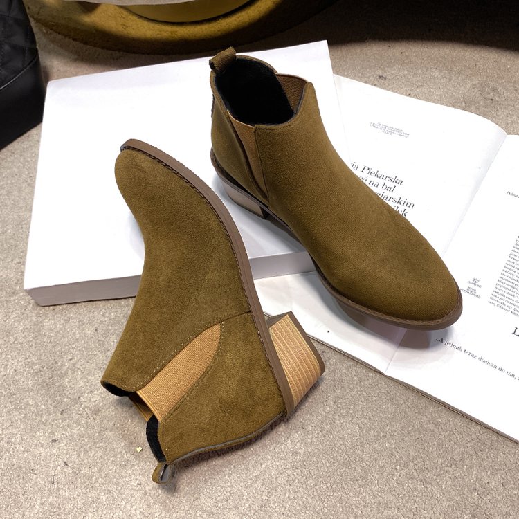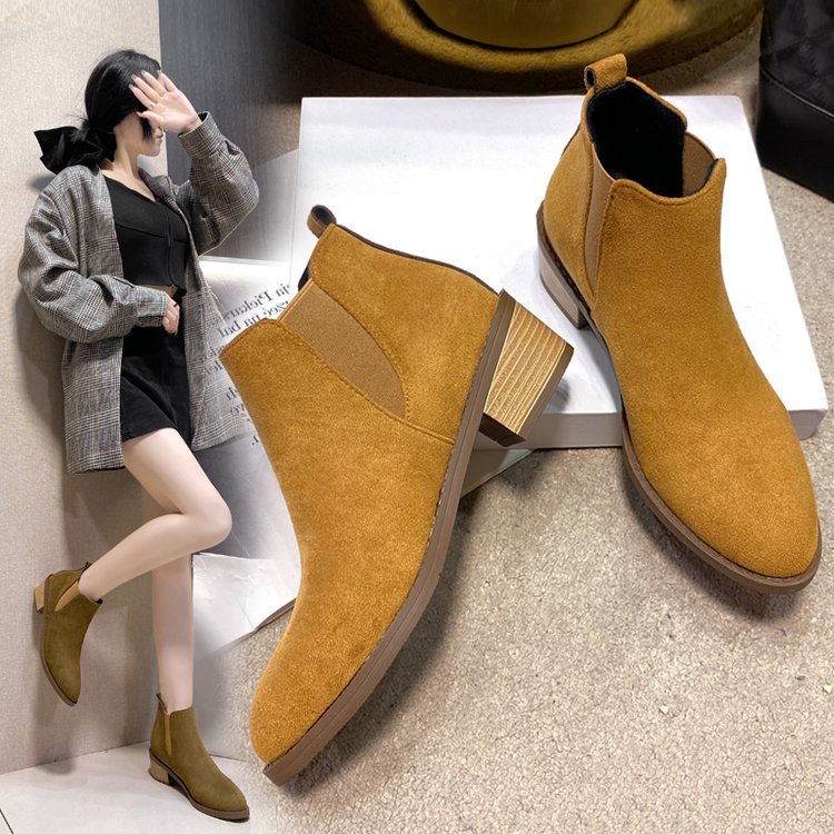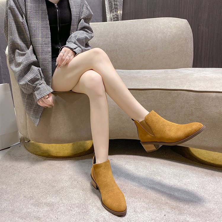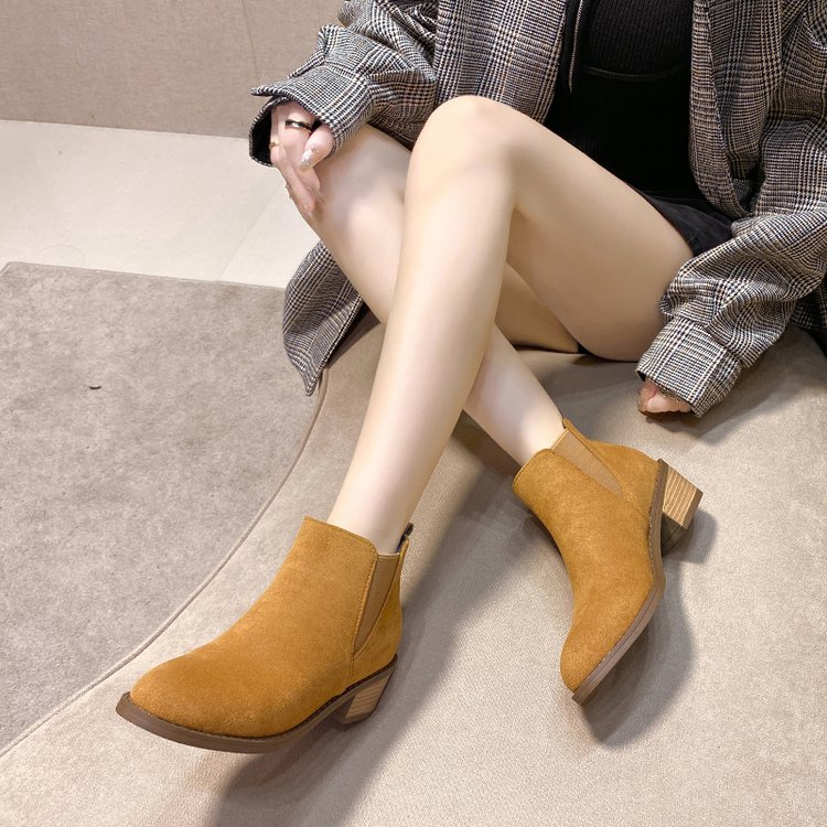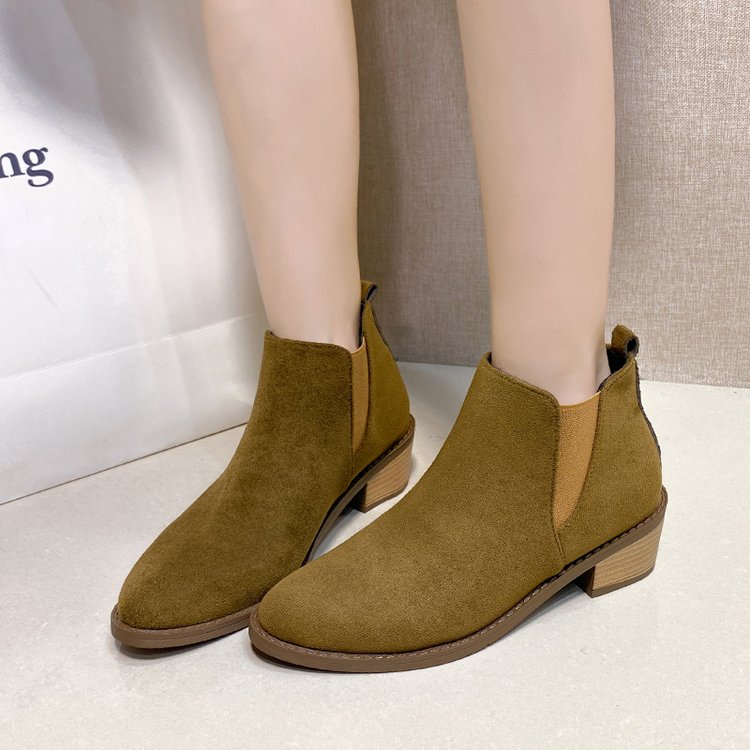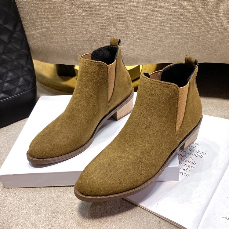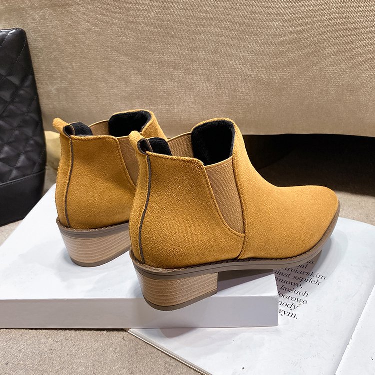 Retro Korean-style Niche Design Pointed-Toe -Lined Chunky Heel Versatile Fashion Short Boots | High Top, Fabric Upper and Insole, PVC Sole, Slip-On Closure, Solid Color, Casual Style for Fall/Winter