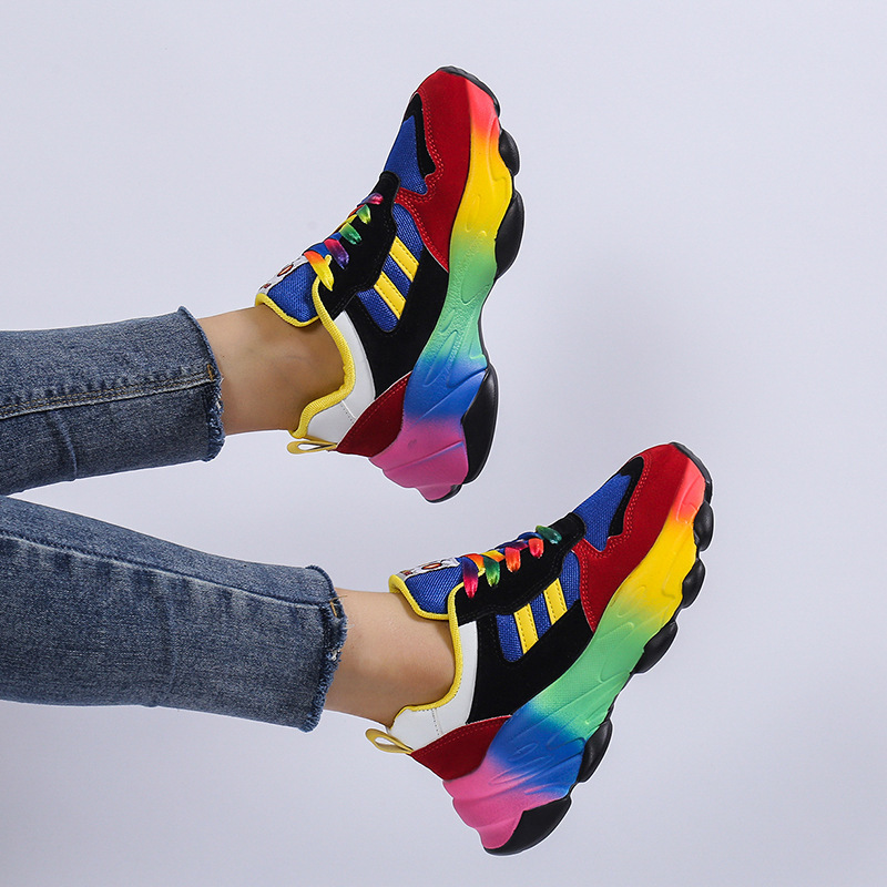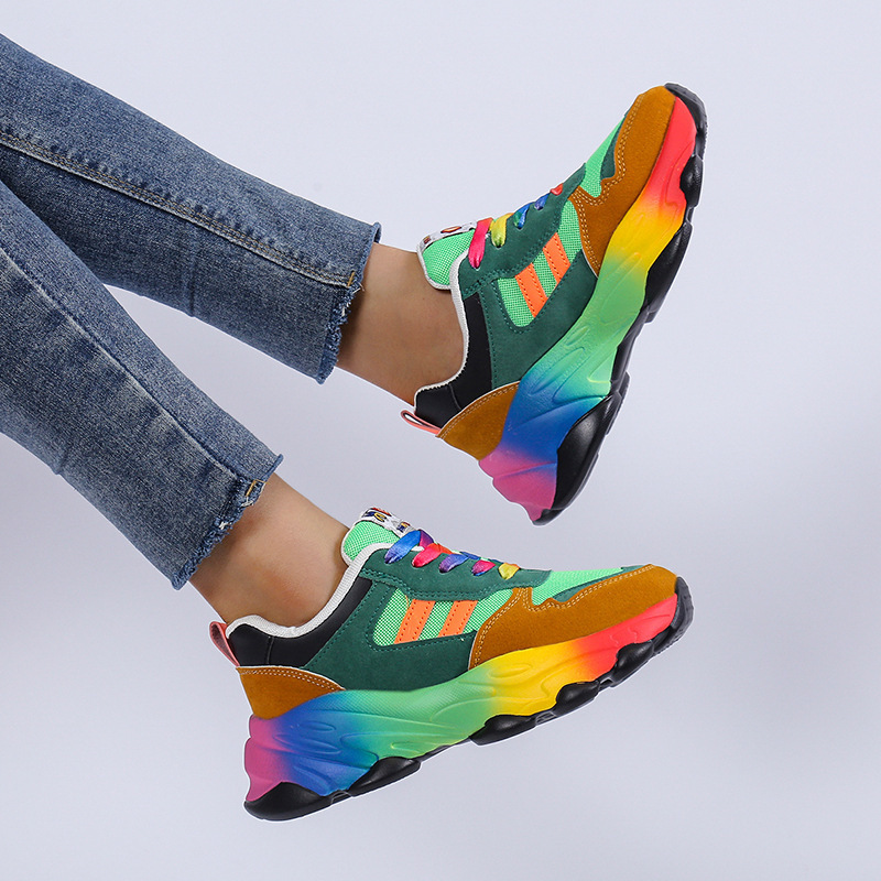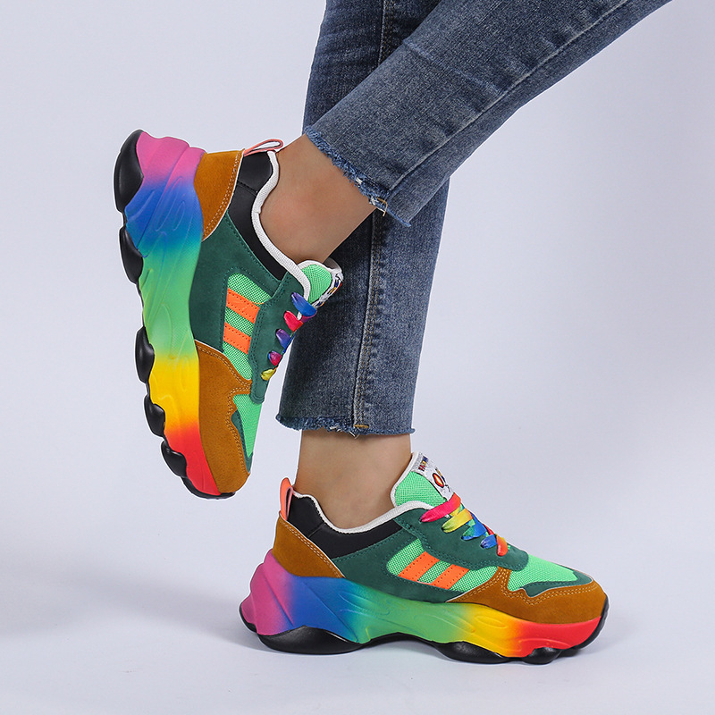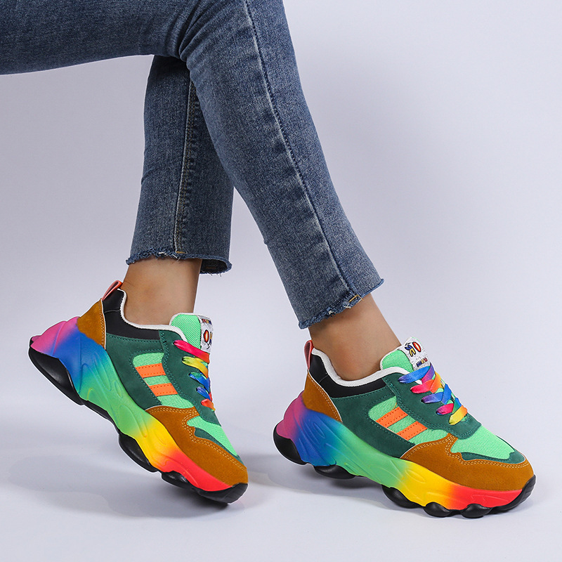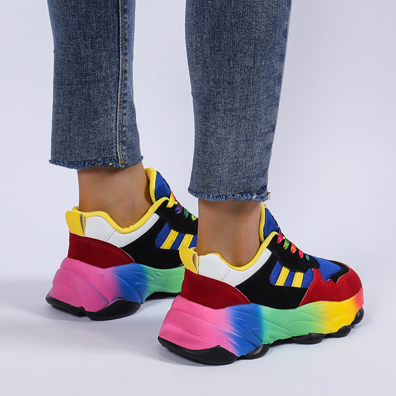 Plus Size Women'S Fashion Sneakers | Breathable Knit Lace-Up Shoes with Colorful Platform Sole, Round Toe, All-season, Sports Style, EVA Upper, Mesh Inner, EVA Insole, Rubber Sole