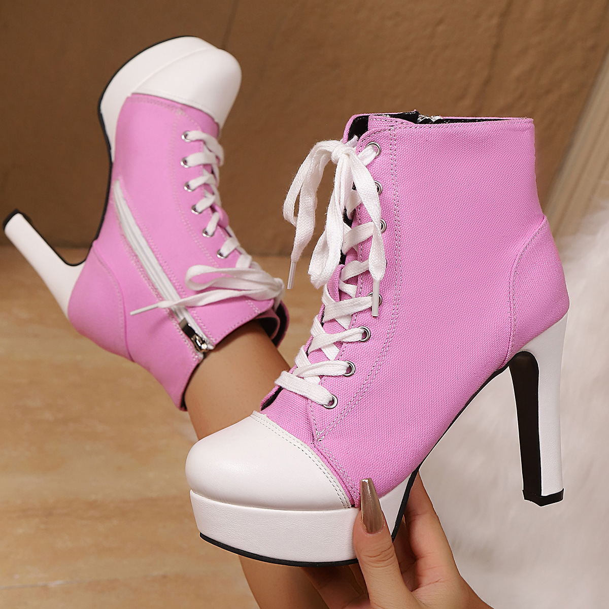 Women'S Chunky Heel Round-Toe Ankle Boots with Lace-Up & Side Zipper Closure - Vibrant Pink & Color-Block Design, Synthetic Cover Upper, Round Toe & Thick Platform Heel, Casual to Semi-Formal Daily Boots with Cushioned Insole & Arch Support