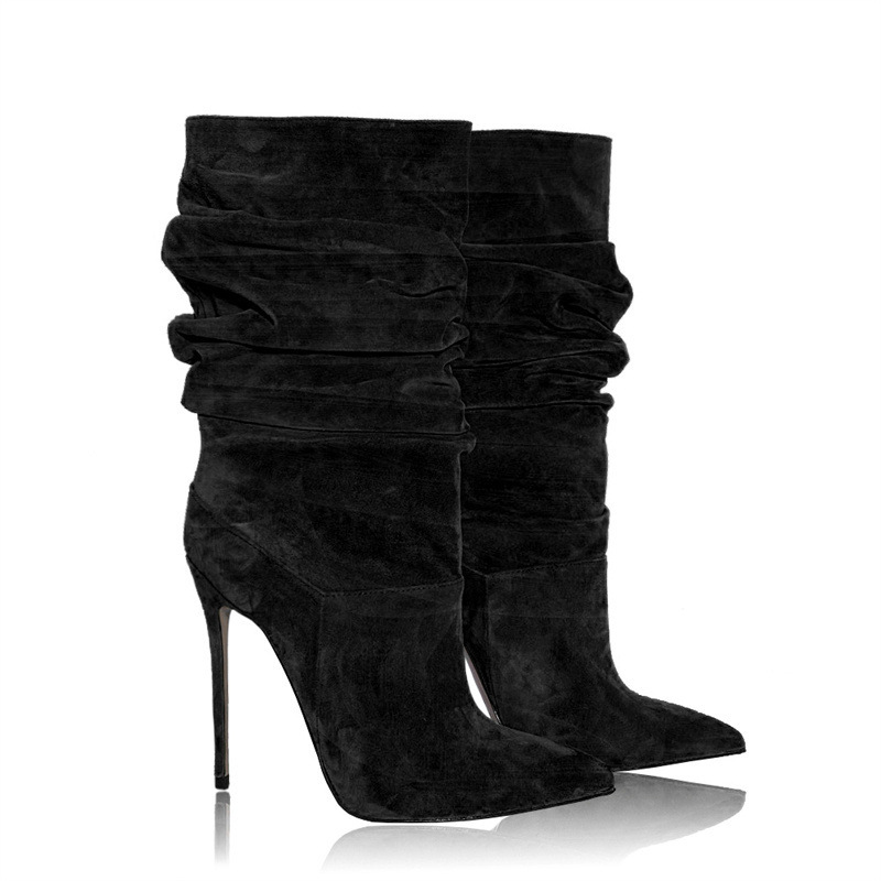 European and American Style Pleated Mid-Calf Boots | New Pointed Toe Patchwork High Heel Sexy Fashion Boots with Stiletto Heel, Slip-on Closure, and Rubber Sole